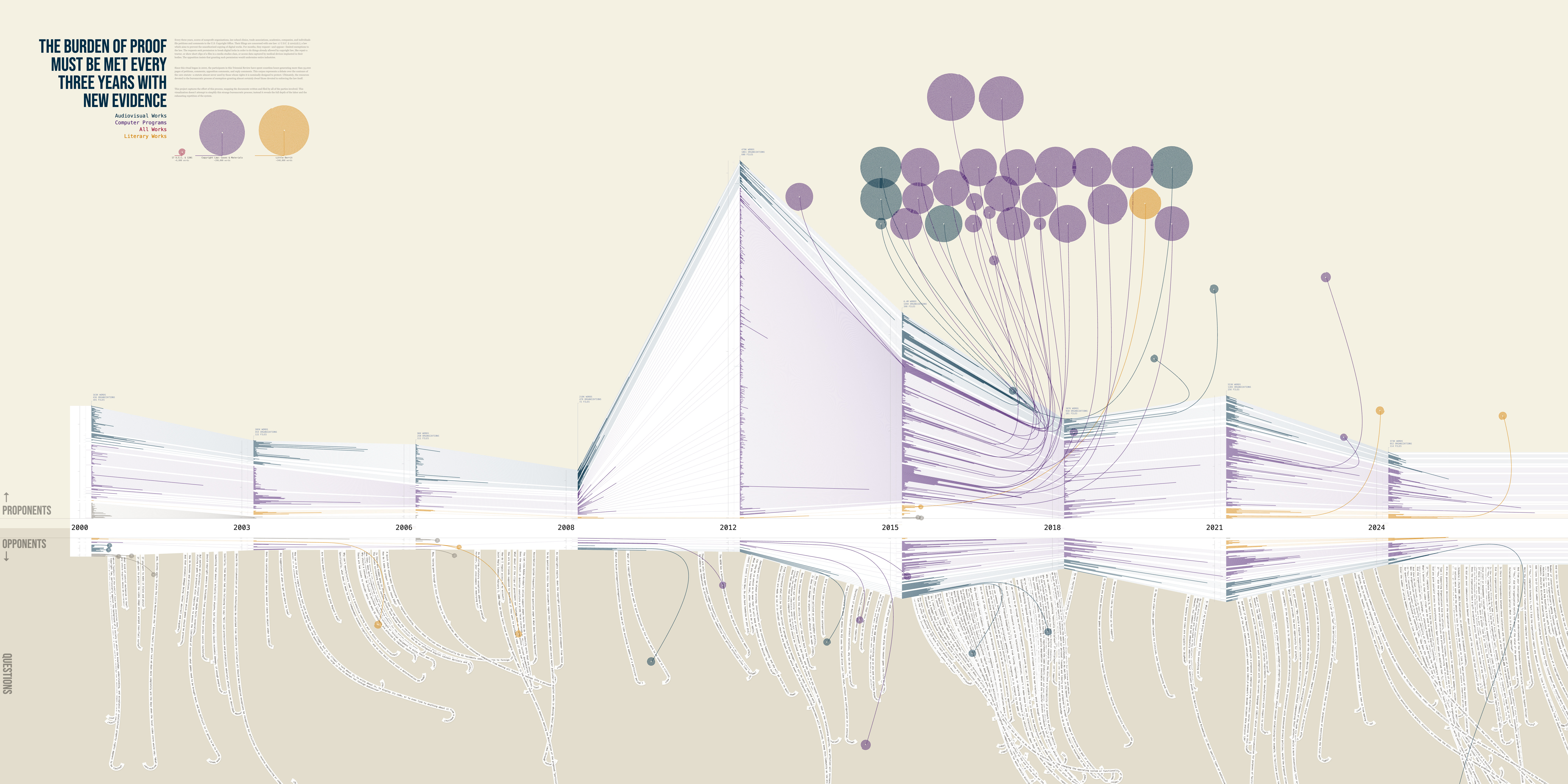 A text analysis and visualization of the public record from nine triennial rulemaking proceedings under 17 U.S.C. § 1201(a)(1) — mapping more than 55,000 pages of petitions, comments, and reply comments filed by scores of organizations, law school clinics, trade associations, academics, and individuals since 2000. This work is a companion to Unbalanced Interests, a report on the proceeding and how the provision is used by rightsholders.